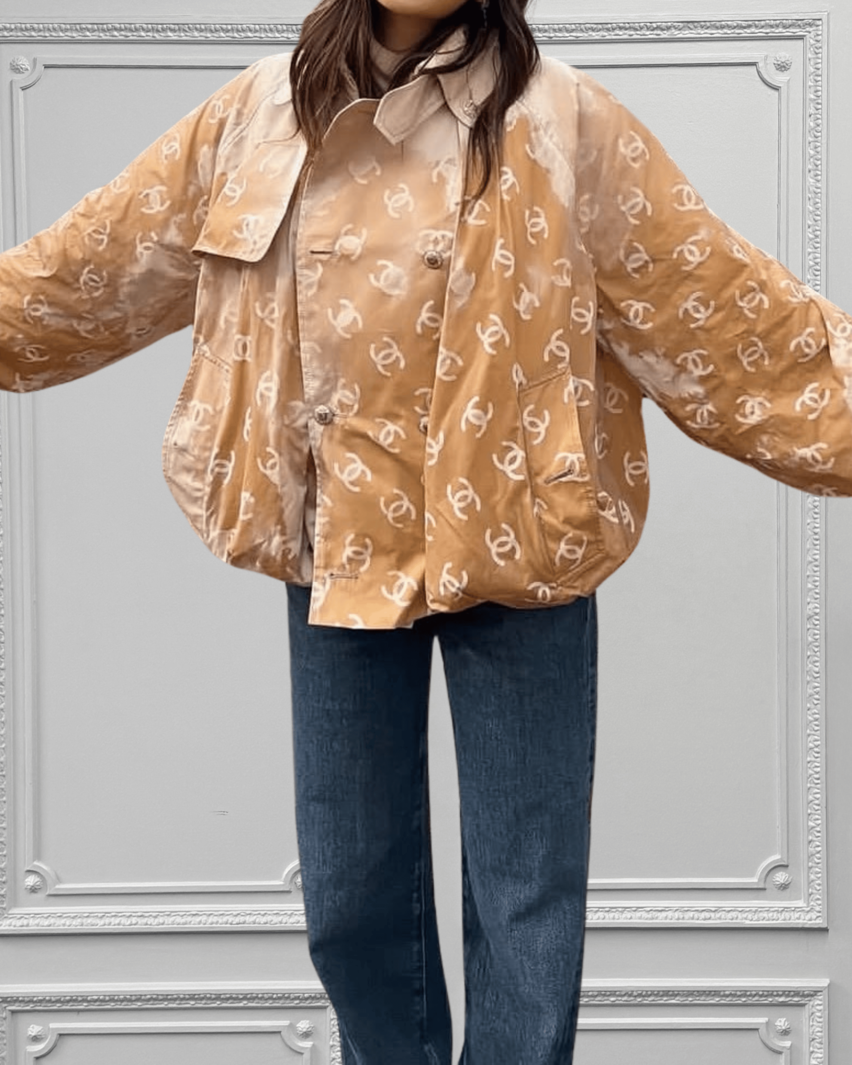 Part of the Chanel Coco Neige 2025/26 Collection, this Chanel trench coat is crafted from innovative reactive fabric that reveals the interlocking CC logo when exposed to water. The coat appears clean and minimalist when dry, but once the surface becomes wet, the hidden double-C monogram gradually emerges, creating a unique and eye-catching effect. Designed using advanced moisture-sensitive ink technology, this trench coat blends luxury craftsmanship with modern innovation. As the concealed CC pattern activates on contact with water, it offers a playful twist on classic Chanel outerwear and making it a standout piece for fashion enthusiasts and collectors. This design is available in both a long trench, and cropped trench, and is ideal for clients seeking rare Chanel pieces, innovative designer outerwear, and high-end fashion featuring reactive materials.