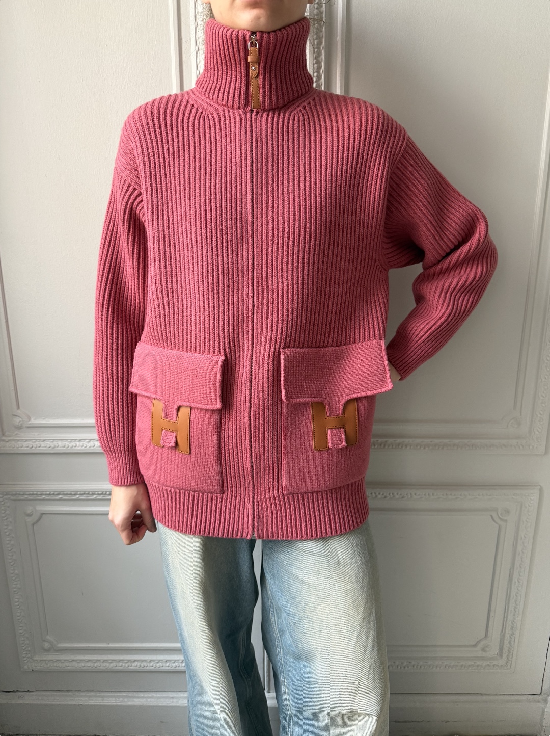 The Hermès Wool Zip Cardigan, crafted from virgin wool and detailed with leather H-pocket patches, combines timeless refinement with a subtle varsity edge. Featuring a high-neck zipper and luxurious texture, it’s an exceptionally rare piece - often sold out and perfect for cooler days styled with knee-high boots.